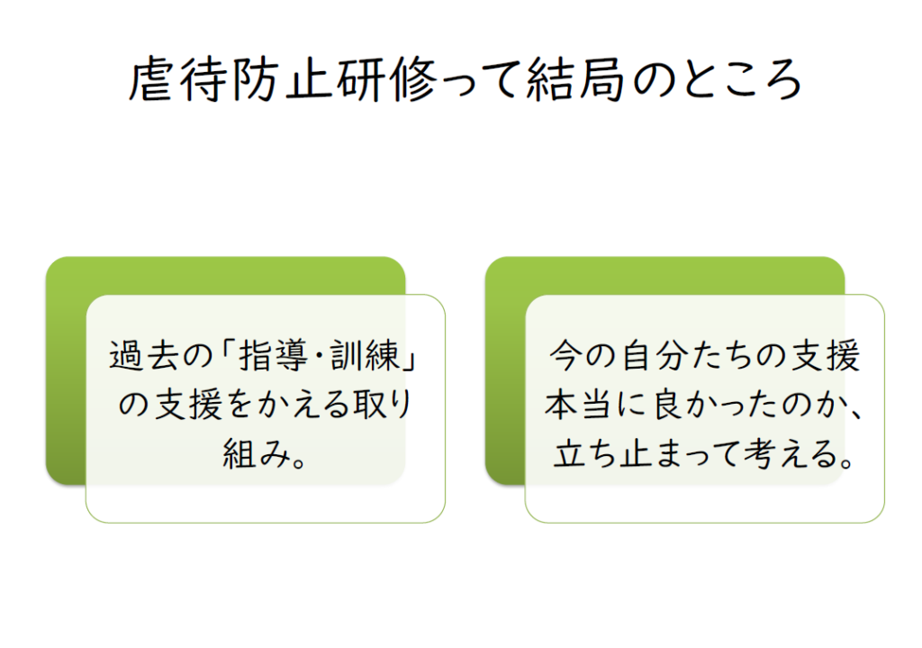 それとは別に、障害への理解や人権・支援スキルに対して学べていない経験の浅い職員の存在もあります。