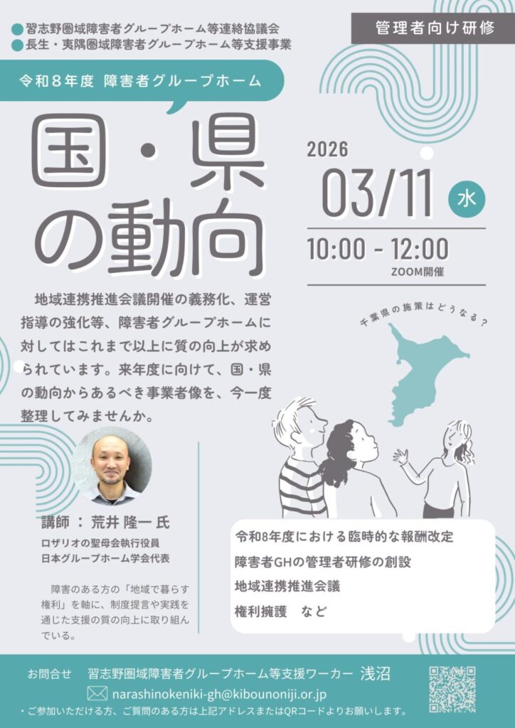 今年度も、習志野圏域障害者グループホーム等連絡協議会と長生夷隅圏域の共催で、管理者ZOOM研修会を開催します。