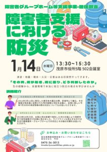 1月14日、長生夷隅圏域にて障害者グループホーム等事業者の他、障害者支援に関わる方向けの防災研修を開催します。 今回の研修では、実際の経験から学ぶことをテーマとし、災害に直面し対処されてきた講師を2名お招きしお話を伺うこ […]